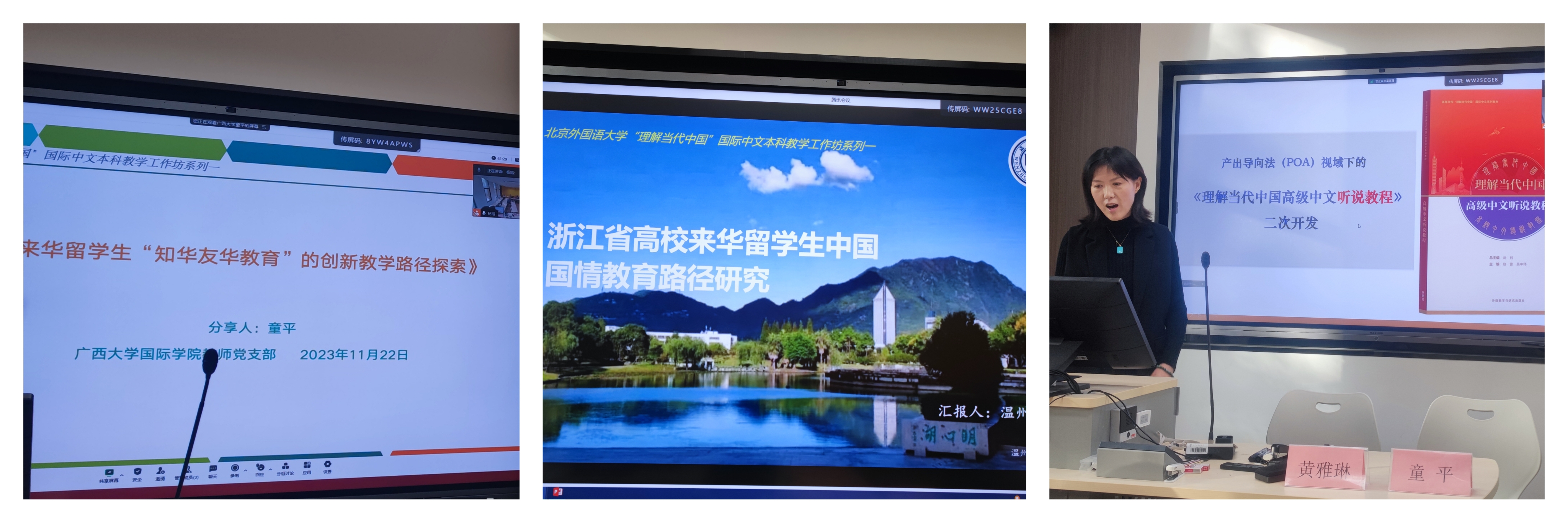 黄雅琳老师发表了题为《浙江省高校来华留学生中国国情教育路径研究》的报告。报告从中国国情教育路径的研究背景和研究现状出发,说明了来华留学生中国国情教育的研究内容和目标。随后,黄雅琳老师专门分享了温州大学在推动国情教育实践基地建设方面的成果,通过具体实例,说明了挖掘地方历史文化中蕴含的优秀地方文化资源,在高校留学生国情教育中凸显中国特色,并应用于第一课堂和第二课堂教学的重要意义。