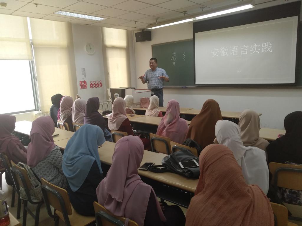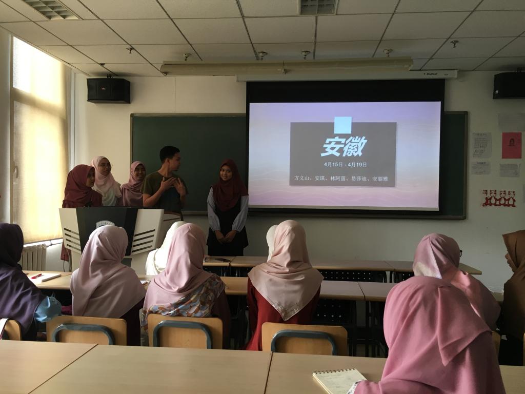 4月15-19日马来西亚留学生赴安徽语言实践,为了总结语言实践的成果,深入了解安徽的风土人情和独具特色的徽派文化,5月14日上午,17级马来班的25名同学举行了安徽语言实践报告会,对外汉语系主任孟德宏老师和办公室的夏菁老师担任此次报告的评委。