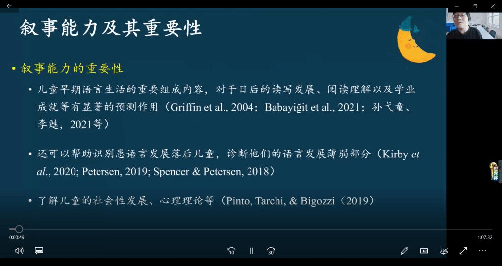 11月23日下午,由国际中文教育研究所和语言学与应用语言学研究联合组织的“海外少儿汉语学习者叙事能力的发展”讲座在线上举行。讲座由国际中文教育研究所所长吴思娜副教授主持,本次邀请的主讲人是买球官方网站的郝美玲教授。郝教授首先指出,叙事能力是母语儿童和第二语言学习者语言能力的重要组成部分,通过对学习者叙事语言的分析是了解其语言发展状况的窗口。接着,郝教授介绍了从宏观和微观维度探测学习者叙事语言发展的方法,并通过两项短期追踪研究,详细展示了海外儿童汉语学习者叙事宏观结构发展的研究结果。郝教授长期致力于儿童母语习得和第二语言习得研究,成果丰硕。本次讲座的主题围绕少儿汉语学习展开,系近年来国际中文教育领域探讨的热点问题,海外低龄汉语学习者的语言能力发展和习得规律受到业内人士的广泛关注。来自买球官方网站两个研究所的30余名教师及部分硕博研究生聆听了本次讲座,郝教授展示的研究不仅具有理论前沿性,而且方法严谨、过程详尽,引起了与会者的强烈兴趣。在讨论环节,老师们也就相关问题同郝教授进行了愉快的交流。本次讲座的举办促进了两所教师间的学术交流,为买球官网国际中文教育学科营造了更加活跃的学术氛围。