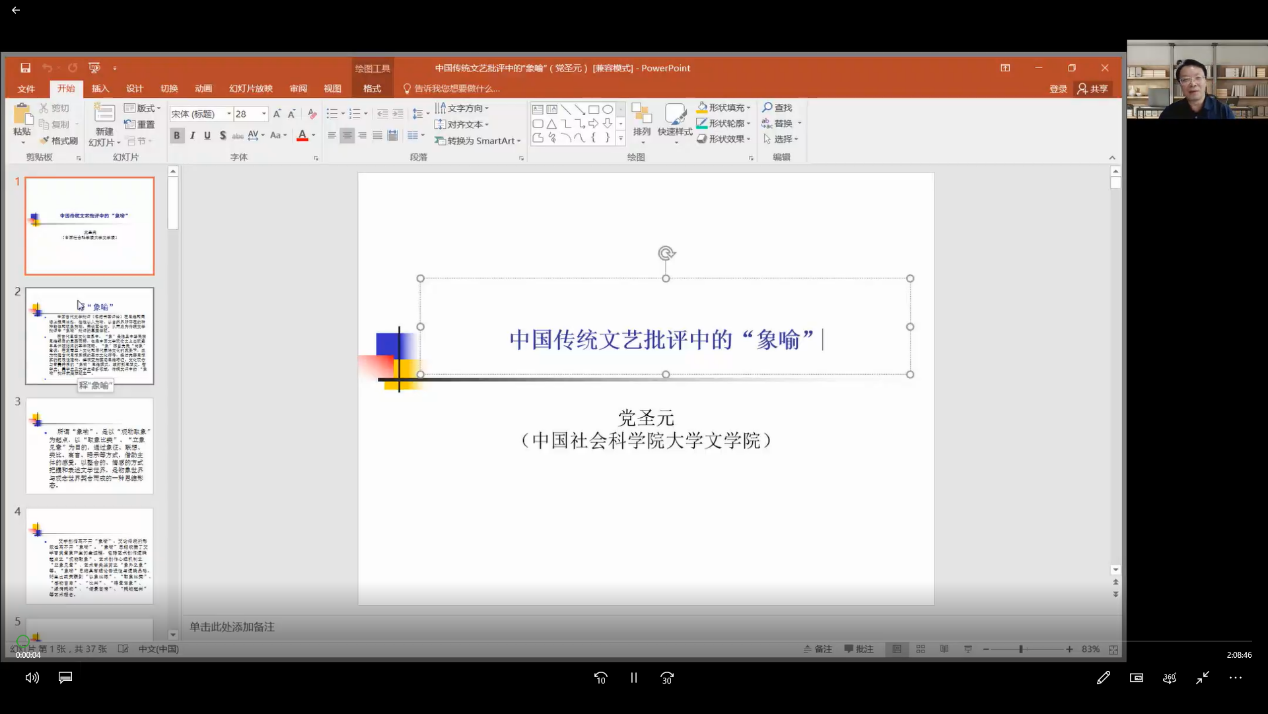 李建盛教授对本场讲座进行了总结,认为党先生对“象喻”的多维阐述,体现了跨学科性,“象喻”不仅是一种理论思维方式,也是一种创作、接受和批评方式。“象喻”这一基础性、核心性的概念,既是历史的,更是未来的,值得学者从跨文化比较等多角度进行进一步的研究思考。李老师对党先生给学院师生带来的精彩学术盛宴表示衷心感谢。