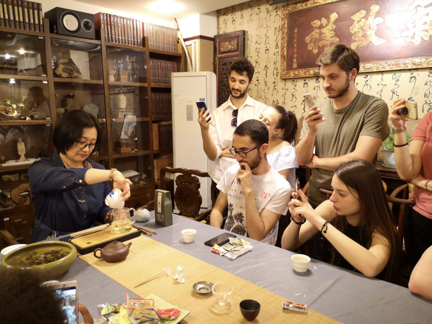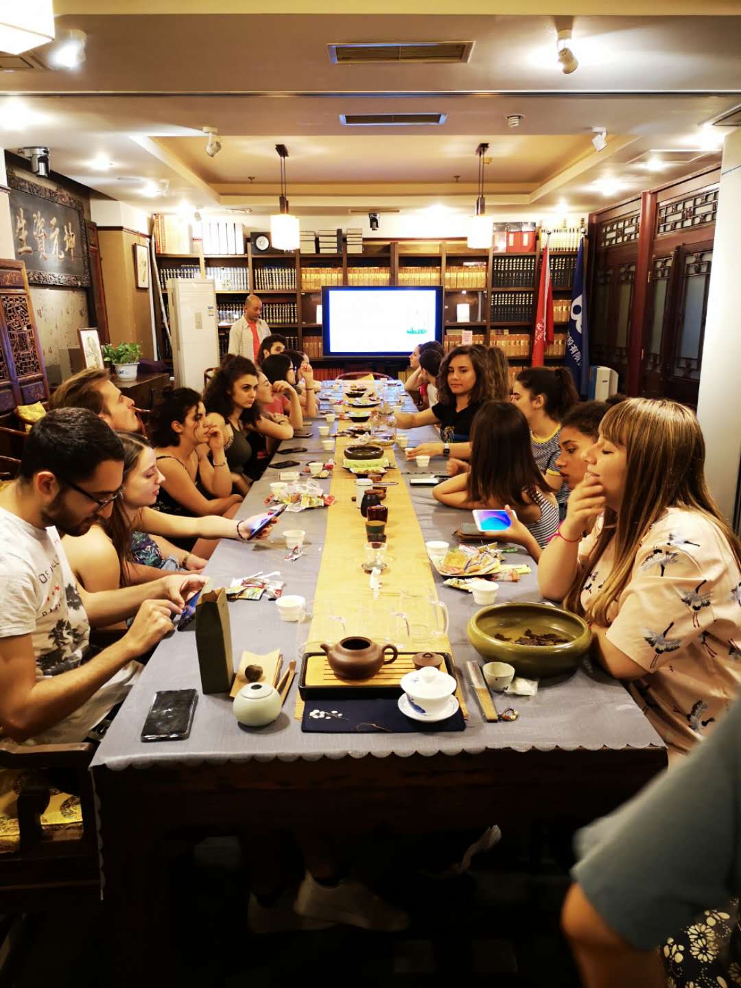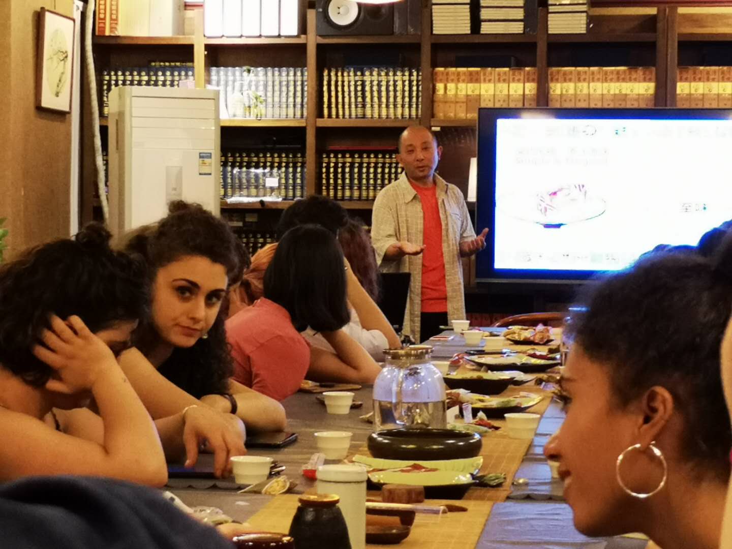 6月12日下午,对外汉语系罗马班学生走入牡丹园的彼岸书店,将中国艺术史的课堂搬到了茶社,陶正宇老师为留学生讲授了品茶、冲泡方法以及茶具品鉴等茶知识。通过陶老师的讲解,学生们对中华茶文化有了初步了解。学生们零距离接触了泡茶、品茶的过程,并亲自冲泡一杯好茶回味中华茶文化的韵味。