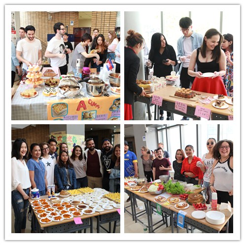 留学生们热情高涨,精心设计了各班的宣传海报,烹制了各国的传统风味美食,比如法国含羞草蛋糕、俄罗斯可丽饼、保加利亚甜点、日本龙田炸鸡、缅甸椰奶果冻、孟加拉炸饺子、瑞典肉丸等,另外还有各种口味的饮品,比如西班牙果酒、百香果特饮、斯里兰卡红茶、日本和韩国的清酒、烧酒、法式调酒等,真是琳琅满目,色香味俱全。这里不仅是各种美食文化相互交流碰撞的市场,也是中外师生进行汉语交流的场所。展台后的留学生用所学汉语跟“顾客”介绍菜名,宣传美味,甚至讨价还价,学以致用,兴致盎然。