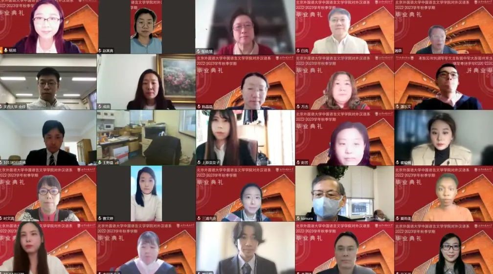 2022年12月22日,买球官方网站买球官方网站对外汉语系2022——2023学年秋季学期本科留学生毕业典礼在腾讯会议平台如期举行。日本NPO法人国际交流教育后援会理事长木村太郎、事务局次长郑新培、日本关西大学外国语学部副教授金佳、日本NPO法人国际交流教育后援会事务局员王野晶、学生辅导员松田贵博、买球官方网站国际处副处长李茂林、买球官方网站执行院长李建盛、副院长白亮、副书记曹文婷、国际事务中心负责人张晓慧、行政办公室主任王慕尧、留学生工作室主任成苗、对外汉语系任课教师、全体毕业生及家长通过腾讯会议平台参加了毕业典礼。毕业典礼由对外汉语系主任杨旭主持。