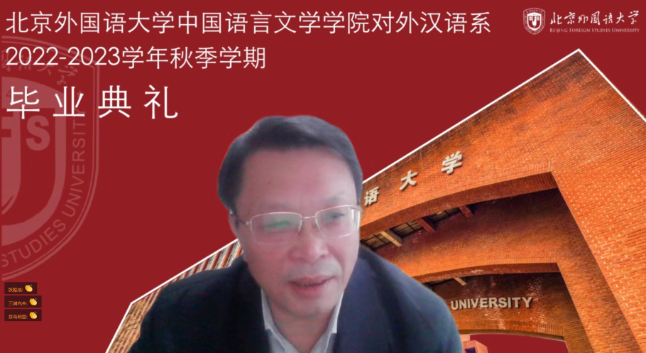 日本NPO法人国际交流教育后援会理事长木村太郎致辞。他祝贺毕业生圆满完成学业,顺利毕业,感谢各位老师对学生的培养,感谢北外、买球官方网站以及留学生办公室在目前疫情如此艰难的情况下为毕业生精心安排了极具纪念意义的毕业典礼。他赞扬了学生在留学之初适应了文化及社会习俗的差异,在新冠疫情爆发后适应了授课方式的调整,克服重重困难取得毕业,收获了知识、经验、信心与勇气,勉励毕业生珍藏疫情之下这几年学习的宝贵经验,在未来遇到意想不到的情况时积极利用,去努力实现自己的梦想,在日本的社会各界、日中之间以及全球各个领域的工作与学习中发挥积极作用。
