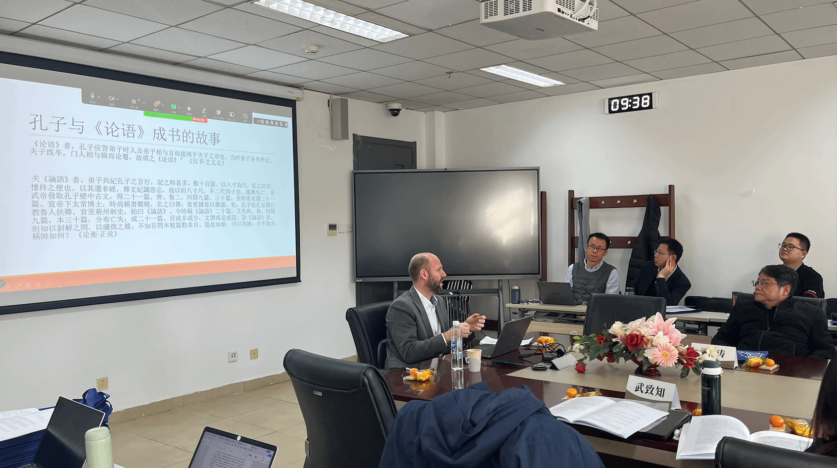 研讨会在上午8:50拉开帷幕。在韩振华教授发表简短引言后,中国人民大学国学院教授梁涛就两次当代著名的《论语》学术争论展开讨论,清华大学出土文献研究与保护中心副教授武致知(Rens Krijgsman)就《仲尼曰》《孔子曰》《语丛》等孔子语录类合集文献的出土和利用发表演讲。基于二位学者的主旨报告,参会学者就《论语》哲学诠释、《论语》成书与接受史问题展开了热烈讨论。