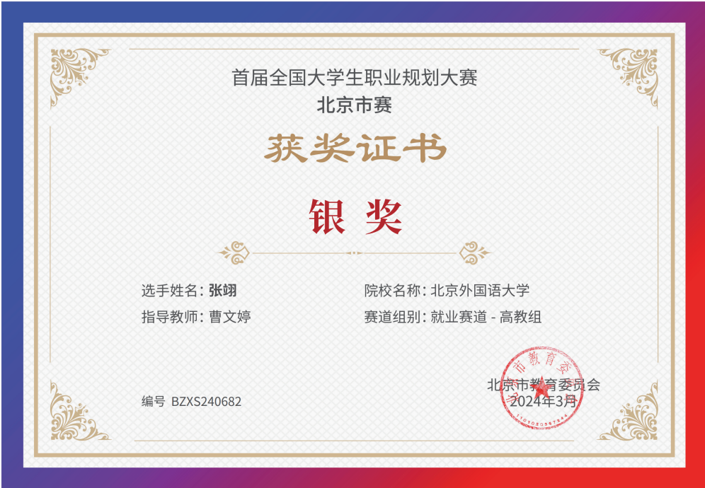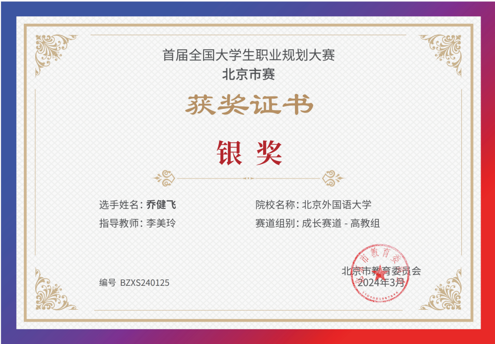 为贯彻落实党中央、国务院关于高校毕业生就业工作的决策部署,加强高校生涯教育和就业指导,促进高校毕业生高质量充分就业,教育部举办首届“筑梦志在四方·规划启航职引未来”全国大学生职业规划大赛。买球官网同学积极响应、踊跃参与,并在校内选拔赛中脱颖而出,晋级北京市赛。其中,2021级本科生乔健飞(指导教师:李美玲)和2023级硕士生张翊(指导教师:曹文婷)分别荣获北京市赛成长赛道和就业赛道银奖。