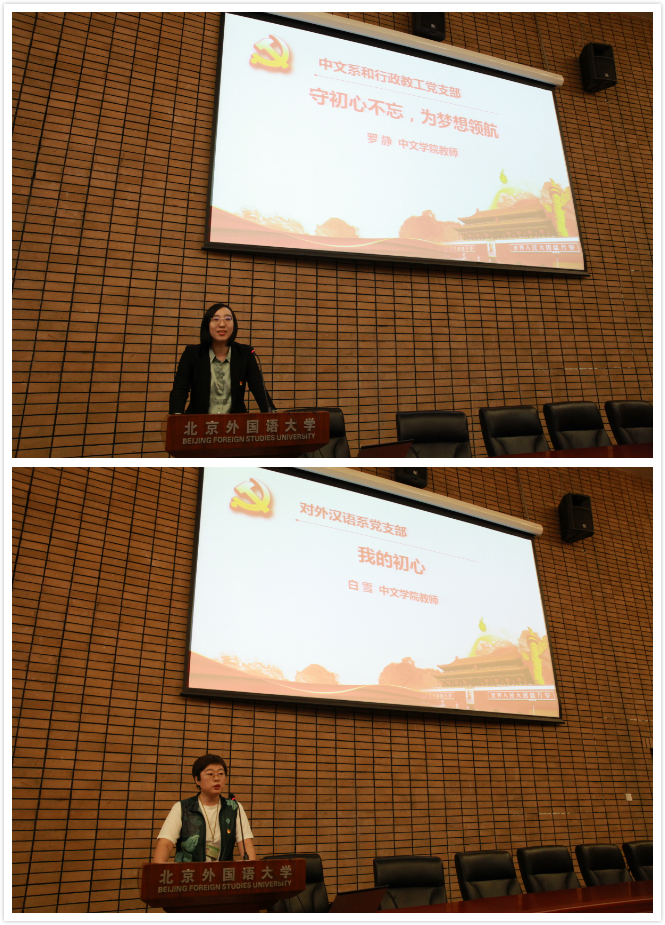 作为教师党员,罗静向与会师生分享了自己的“教师梦”。她说,自己如愿成为了一名人民教师,我们要用爱心和真心关爱学生,培养社会主义事业建设者和接班人,要将中国特色社会主义理论融入优秀传统文学文化教育教学过程之中,给予学生们正确的“三观”,要坚守立德树人初心,担当党员教师的重要使命。白雪演讲时说,作为对外汉语专业教师,培养学生客观认识中国、了解中国是重要的教学目标。立足自身实际,“我的初心”就是要将正确的观点与立场融入教材和教学内容,不忘“为人民谋幸福,为民族谋复兴”的初心,为把中国介绍给世界贡献自己的力量。